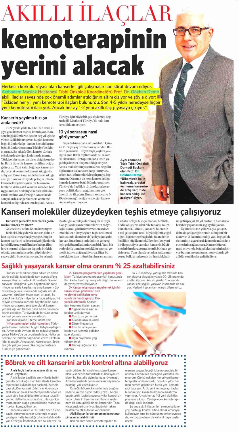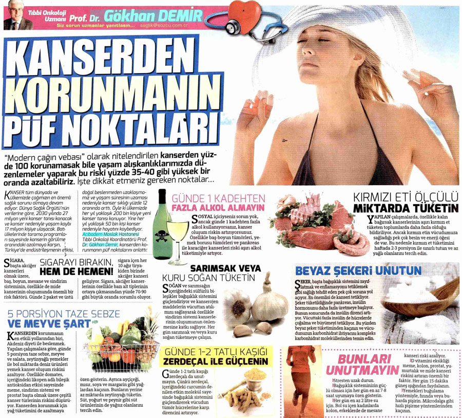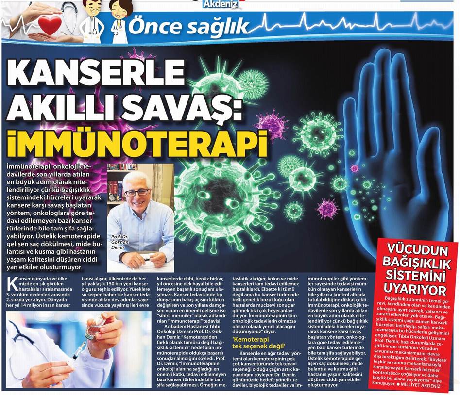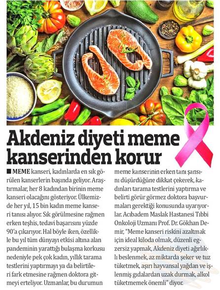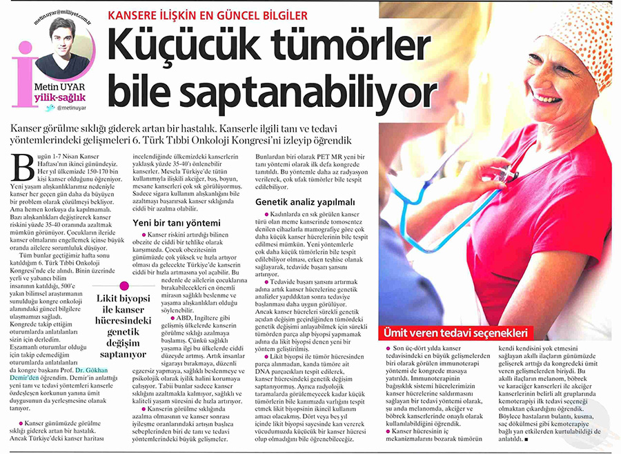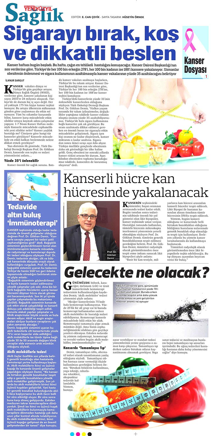 Dünya Gazetesi,17.11.2020 Akciğer Kanseri Akdeniz Diyeti Meme Kanserinden Korur Kanser Akıllı Savaş İmmünoterapi Meme Kanserinin Farkında Olalım Meme Kanserinde Erken Teşhis Kadınlarda En Sık Görülen Kanser Tipi Medikal Plus 02.2017-Akciyer Teşhis ve Tedavisinde Devrim Niteliğinde Gelişmeler Var ! Yeni Yüzyıl,01.04.2016 - Sigarayı Bırak, Koş ve Dikkatli Beslen Milliyet,07.04.2015 -Akıllı Moleküllerin Başarısı Sevindirici Vatan Makaron,20.02.2015-Akıllı İlaçlar Kemoterapinin Yerini Alacak Popüler Sağlık,01.01.2015- Kanser Hücrelerinin Şifreleri Hızla Çözülüyor! Türkiye Gazetesi,29.03.2016 - Dört Kanserden Biri Engellenebilir Sözcü Şık,14.04.2015 -Kanserden Korunmanın Püf Noktaları Star,29.04.2015 - Kanser İlacı Simsarlarına Kötü Haber Milliyet Cumartesi,10.10.2015 - Kontrolleri Sakın İhmal Etmeyin ! Türkiye Gazetesi,28.04.2015 - Vücudun Askerleri kanser Hücresine Karşı Habertürk Magazin,03.10.2016 - Meme Kanserini Erken Anla Şifayı Yakala Korkusuz,19.04.2015 - Kanser Riskinizi Nasıl Azaltırsınız ? Star,26.04.2015 - Kanserde Yanlış Beslenme Öldürüyor Vatan Pazar,20.09.2015 - Birinci Dereceden İki Yakınınızda Meme Kanseri Varsa Risk Artıyor Habertürk,10.03.2015 - Oksijen Kanseri Azaltır Mı? Milliyet Cumartesi,02.04.2016 -Kansere İlişkin En Güncel Bilgiler Habertürk Magazin,04.10.2016 - Meme Kanserinden Korkmayın Önlem Alın