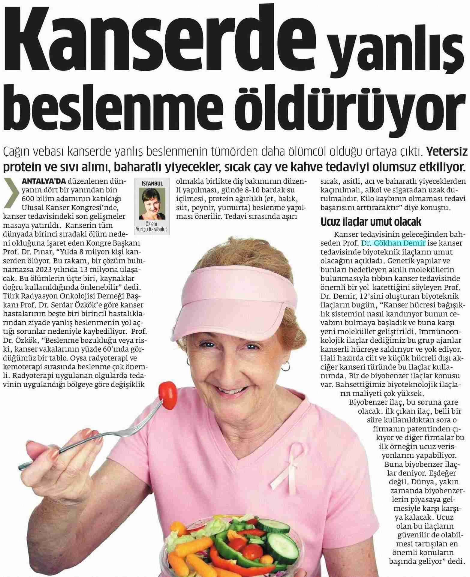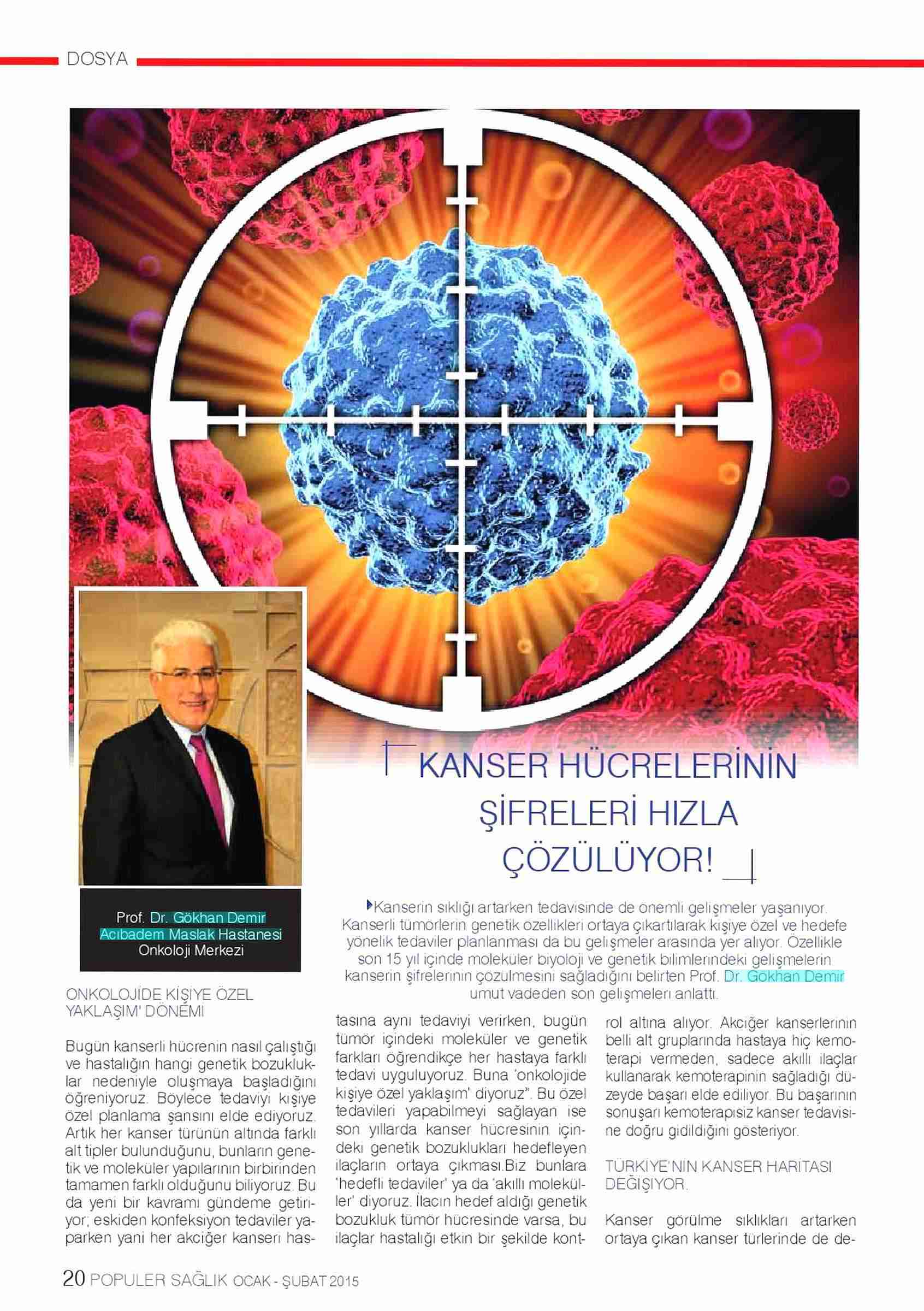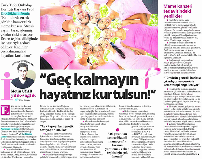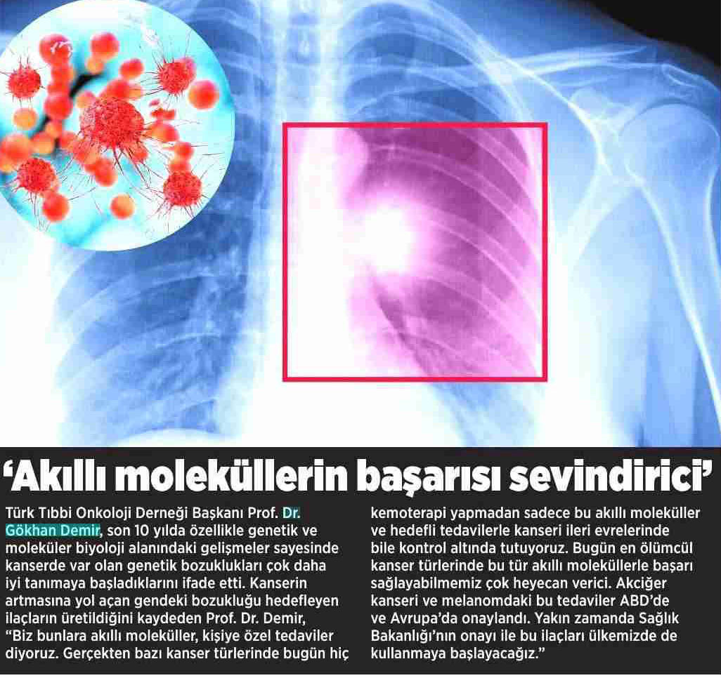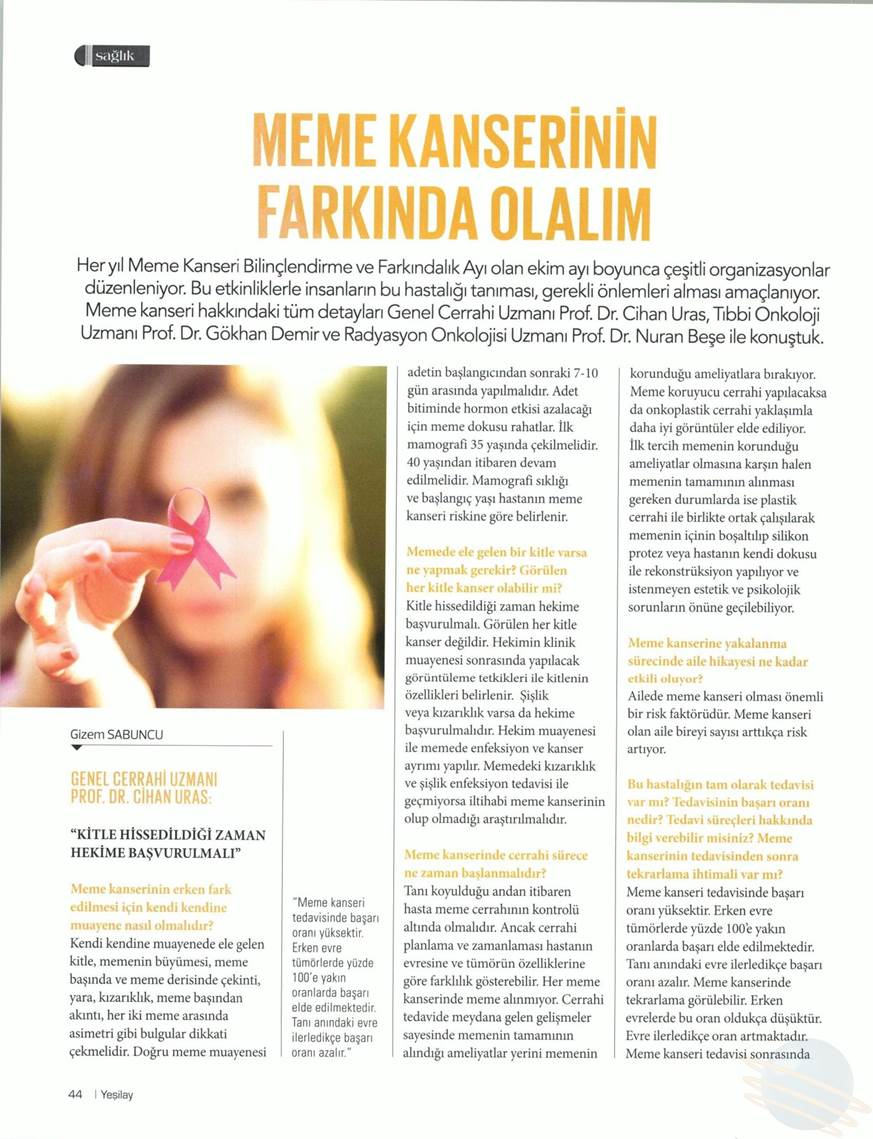 Dünya Gazetesi,17.11.2020 Akciğer Kanseri Akdeniz Diyeti Meme Kanserinden Korur Kanser Akıllı Savaş İmmünoterapi Meme Kanserinin Farkında Olalım Meme Kanserinde Erken Teşhis Kadınlarda En Sık Görülen Kanser Tipi Medikal Plus 02.2017-Akciyer Teşhis ve Tedavisinde Devrim Niteliğinde Gelişmeler Var ! Yeni Yüzyıl,01.04.2016 - Sigarayı Bırak, Koş ve Dikkatli Beslen Milliyet,07.04.2015 -Akıllı Moleküllerin Başarısı Sevindirici Vatan Makaron,20.02.2015-Akıllı İlaçlar Kemoterapinin Yerini Alacak Popüler Sağlık,01.01.2015- Kanser Hücrelerinin Şifreleri Hızla Çözülüyor! Türkiye Gazetesi,29.03.2016 - Dört Kanserden Biri Engellenebilir Sözcü Şık,14.04.2015 -Kanserden Korunmanın Püf Noktaları Star,29.04.2015 - Kanser İlacı Simsarlarına Kötü Haber Milliyet Cumartesi,10.10.2015 - Kontrolleri Sakın İhmal Etmeyin ! Türkiye Gazetesi,28.04.2015 - Vücudun Askerleri kanser Hücresine Karşı Habertürk Magazin,03.10.2016 - Meme Kanserini Erken Anla Şifayı Yakala Korkusuz,19.04.2015 - Kanser Riskinizi Nasıl Azaltırsınız ? Star,26.04.2015 - Kanserde Yanlış Beslenme Öldürüyor Vatan Pazar,20.09.2015 - Birinci Dereceden İki Yakınınızda Meme Kanseri Varsa Risk Artıyor Habertürk,10.03.2015 - Oksijen Kanseri Azaltır Mı? Milliyet Cumartesi,02.04.2016 -Kansere İlişkin En Güncel Bilgiler Habertürk Magazin,04.10.2016 - Meme Kanserinden Korkmayın Önlem Alın