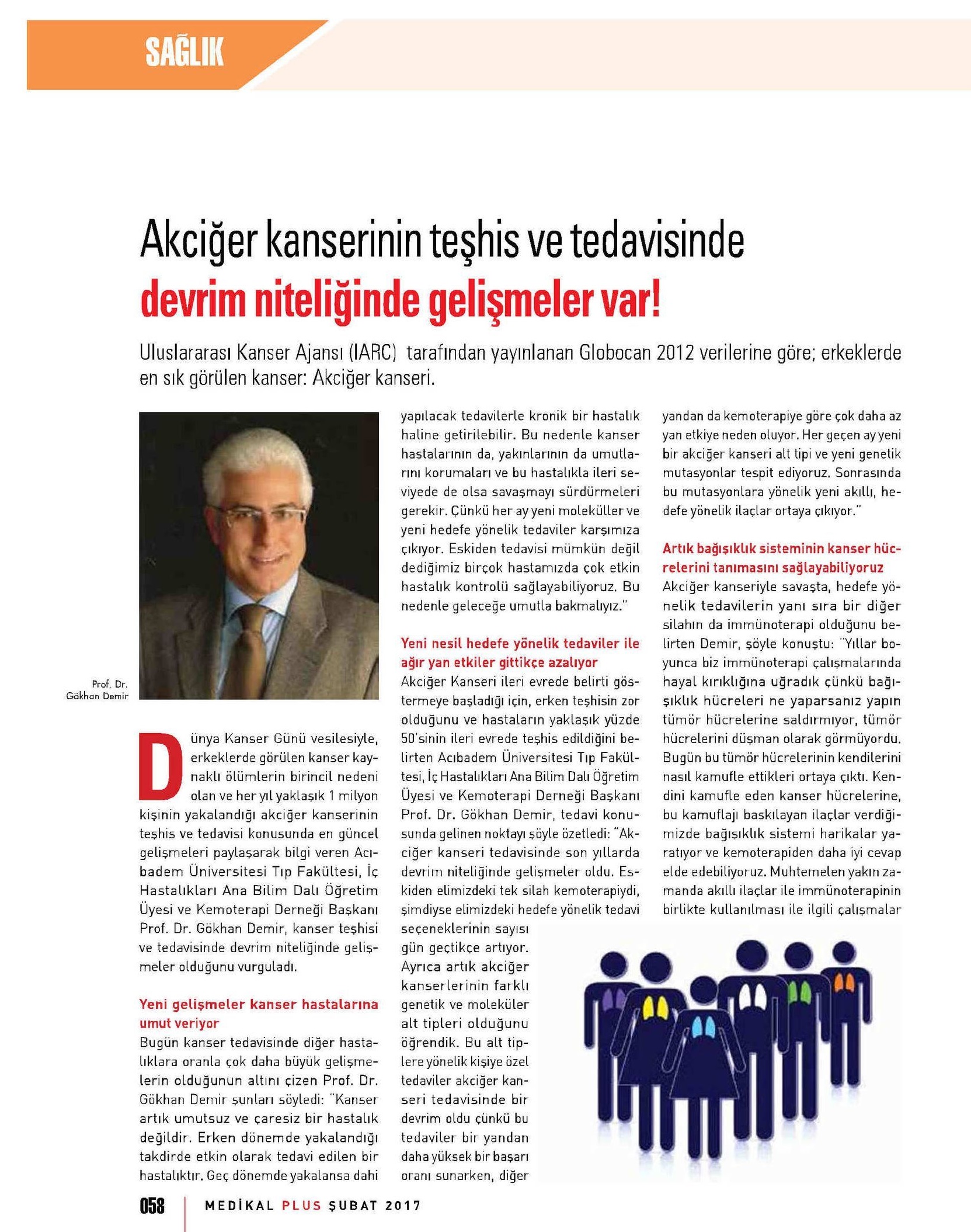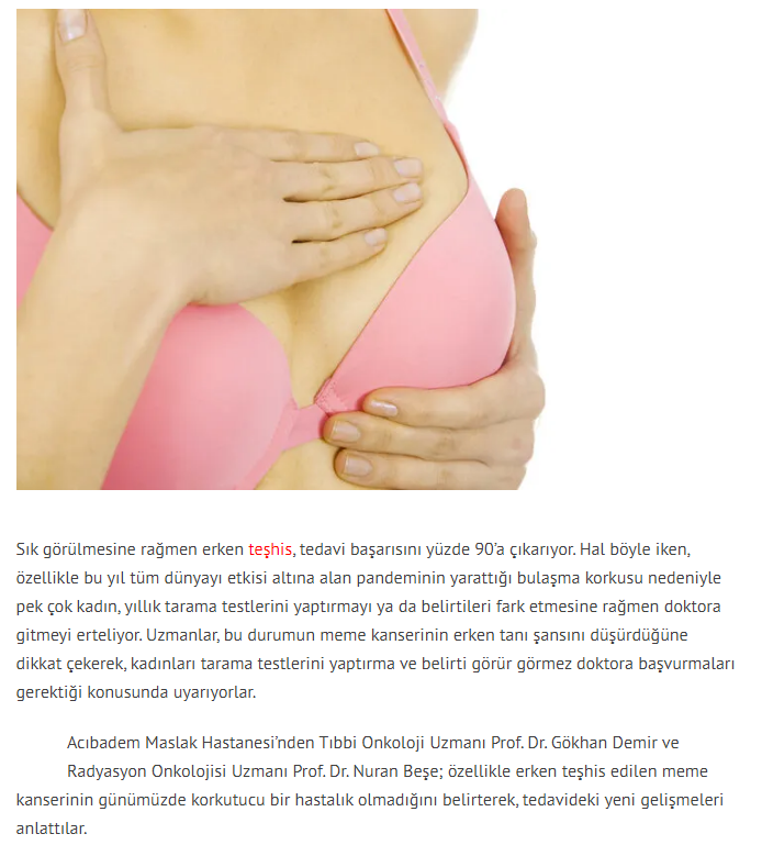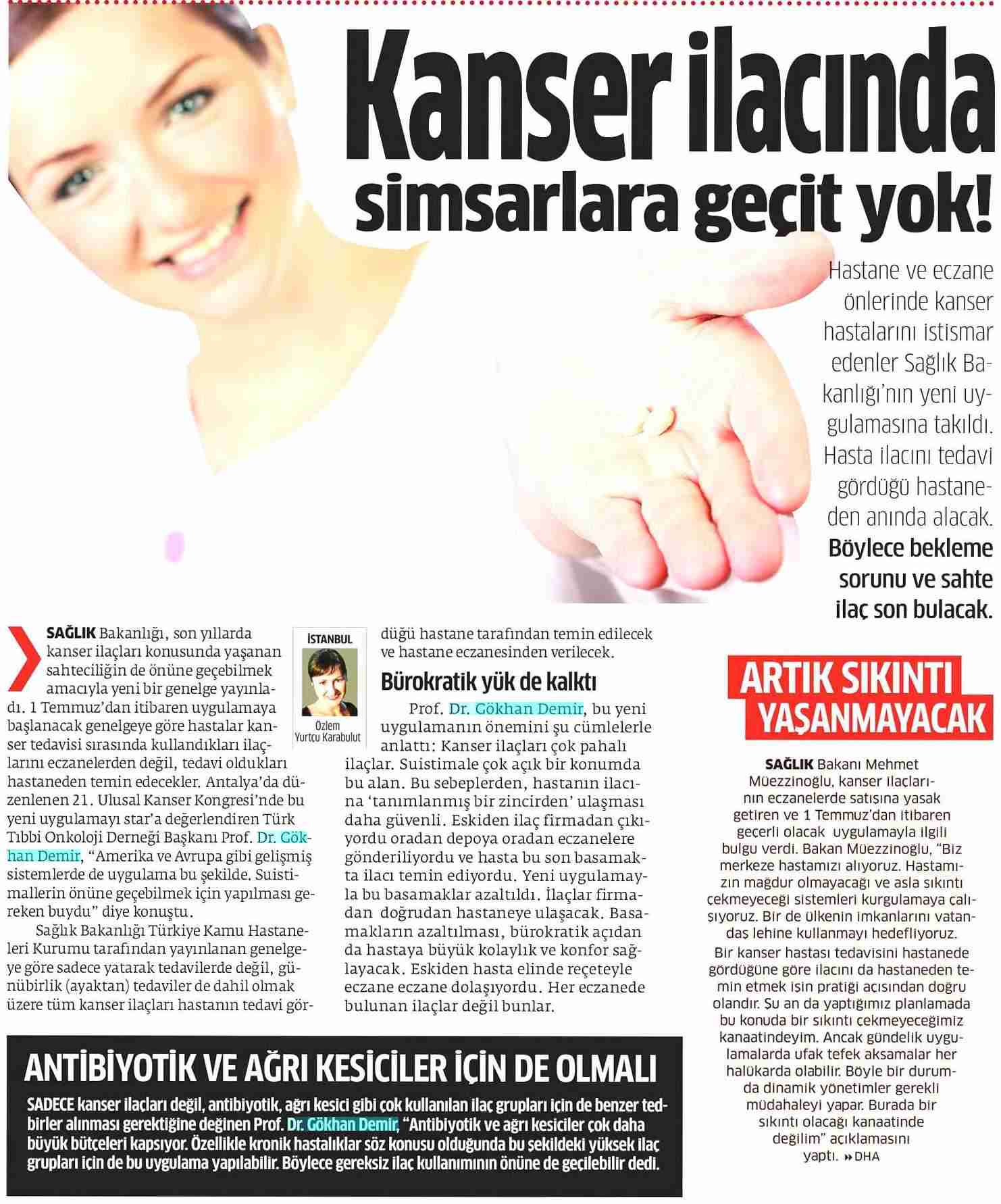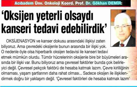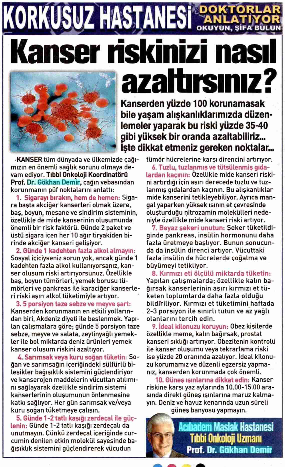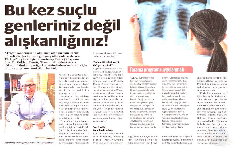 Dünya Gazetesi,17.11.2020 Akciğer Kanseri Akdeniz Diyeti Meme Kanserinden Korur Kanser Akıllı Savaş İmmünoterapi Meme Kanserinin Farkında Olalım Meme Kanserinde Erken Teşhis Kadınlarda En Sık Görülen Kanser Tipi Medikal Plus 02.2017-Akciyer Teşhis ve Tedavisinde Devrim Niteliğinde Gelişmeler Var ! Yeni Yüzyıl,01.04.2016 - Sigarayı Bırak, Koş ve Dikkatli Beslen Milliyet,07.04.2015 -Akıllı Moleküllerin Başarısı Sevindirici Vatan Makaron,20.02.2015-Akıllı İlaçlar Kemoterapinin Yerini Alacak Popüler Sağlık,01.01.2015- Kanser Hücrelerinin Şifreleri Hızla Çözülüyor! Türkiye Gazetesi,29.03.2016 - Dört Kanserden Biri Engellenebilir Sözcü Şık,14.04.2015 -Kanserden Korunmanın Püf Noktaları Star,29.04.2015 - Kanser İlacı Simsarlarına Kötü Haber Milliyet Cumartesi,10.10.2015 - Kontrolleri Sakın İhmal Etmeyin ! Türkiye Gazetesi,28.04.2015 - Vücudun Askerleri kanser Hücresine Karşı Habertürk Magazin,03.10.2016 - Meme Kanserini Erken Anla Şifayı Yakala Korkusuz,19.04.2015 - Kanser Riskinizi Nasıl Azaltırsınız ? Star,26.04.2015 - Kanserde Yanlış Beslenme Öldürüyor Vatan Pazar,20.09.2015 - Birinci Dereceden İki Yakınınızda Meme Kanseri Varsa Risk Artıyor Habertürk,10.03.2015 - Oksijen Kanseri Azaltır Mı? Milliyet Cumartesi,02.04.2016 -Kansere İlişkin En Güncel Bilgiler Habertürk Magazin,04.10.2016 - Meme Kanserinden Korkmayın Önlem Alın