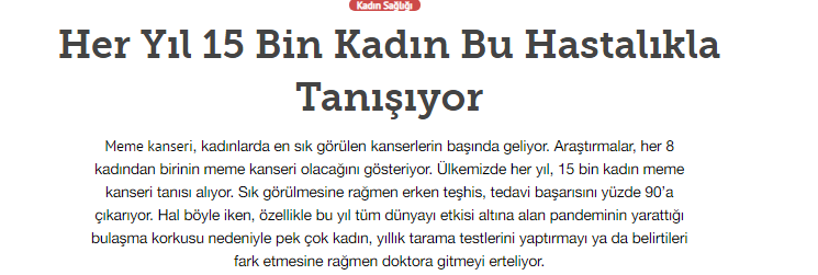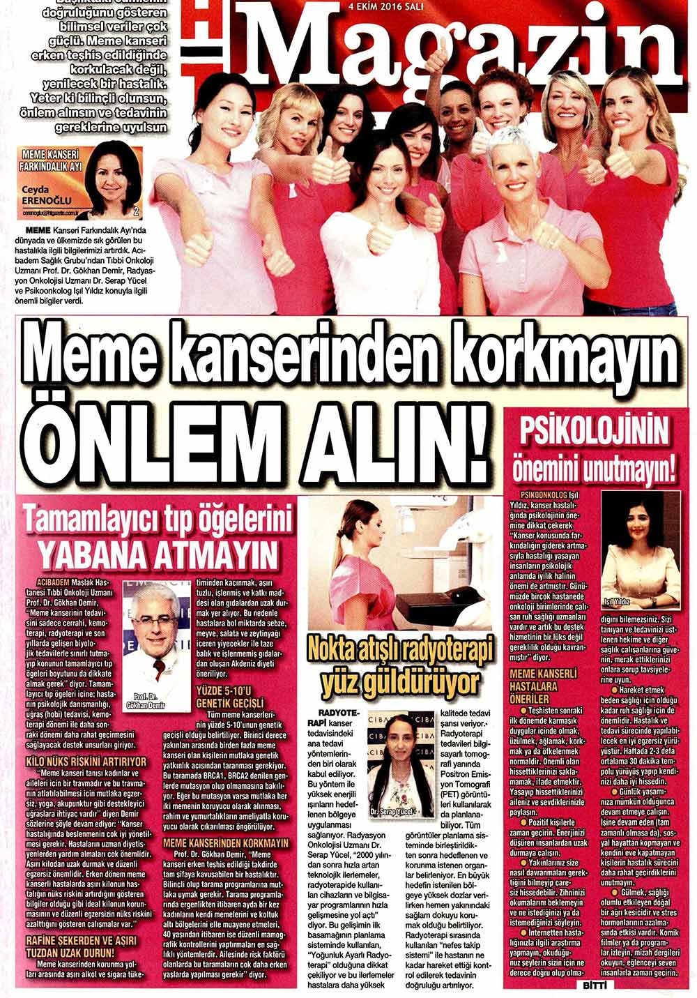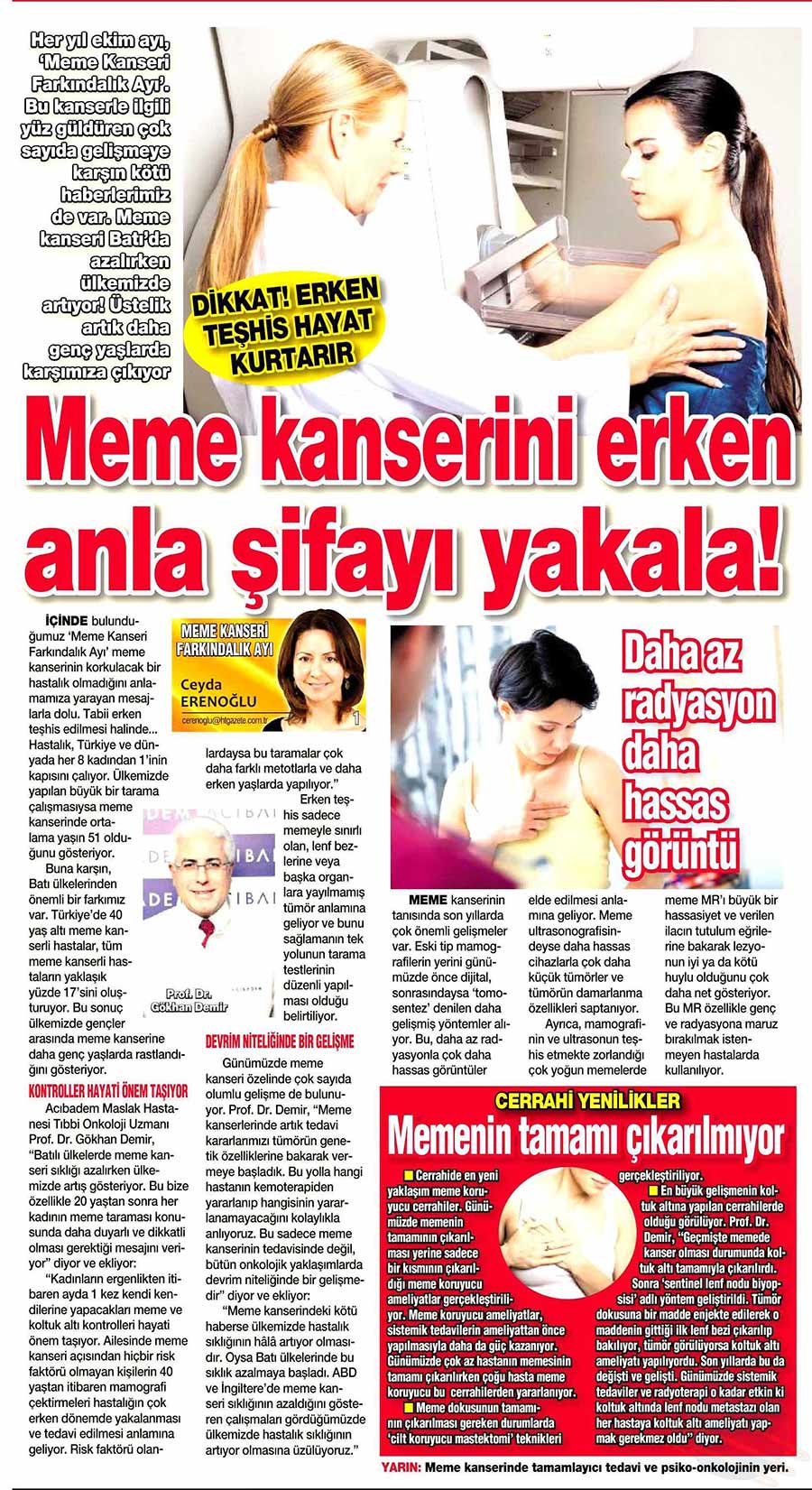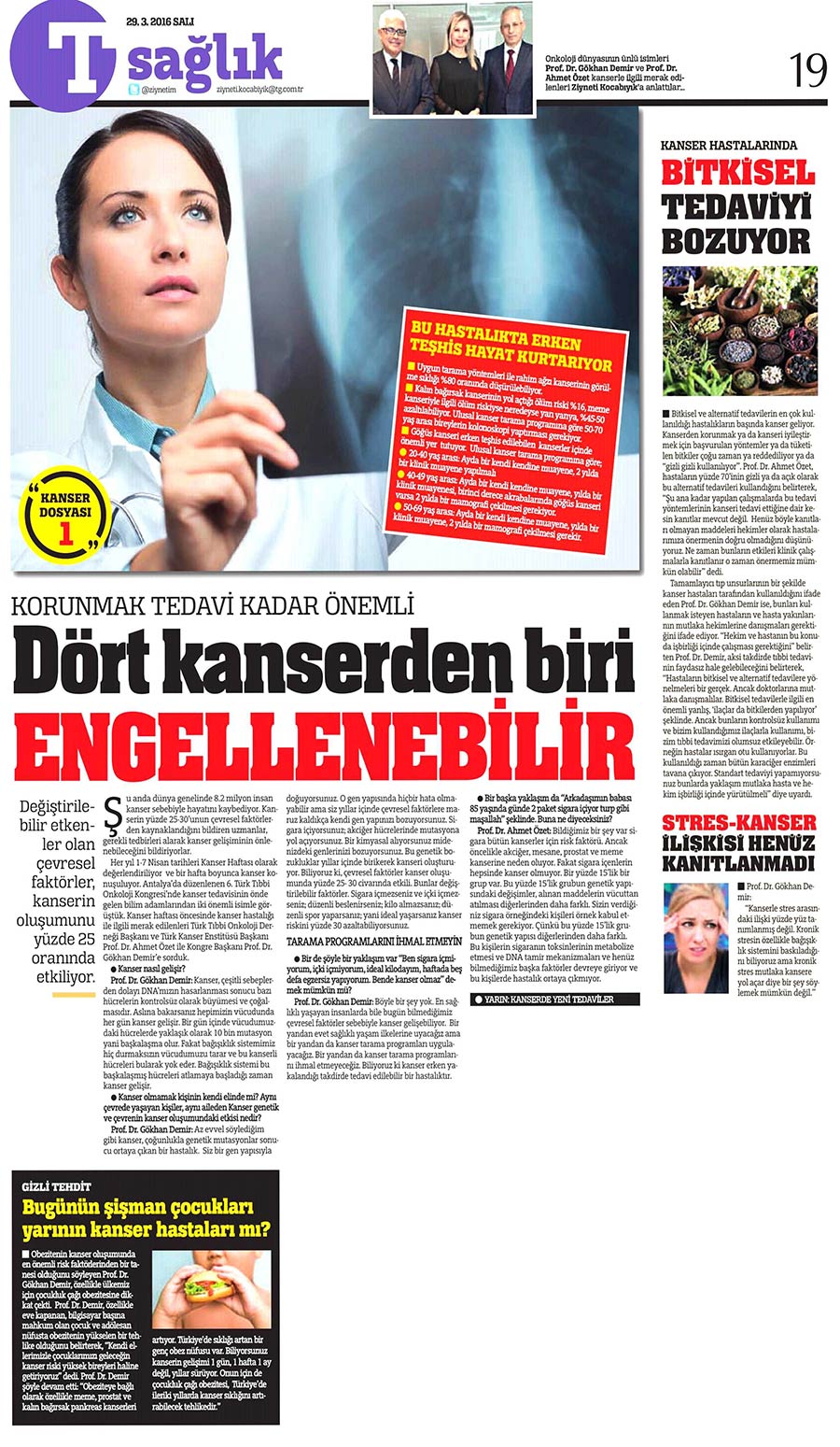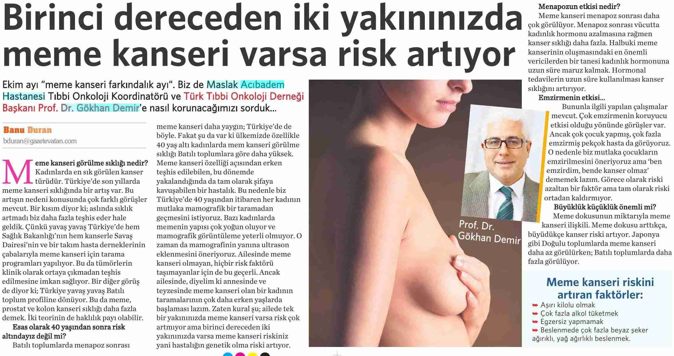 Dünya Gazetesi,17.11.2020 Akciğer Kanseri Akdeniz Diyeti Meme Kanserinden Korur Kanser Akıllı Savaş İmmünoterapi Meme Kanserinin Farkında Olalım Meme Kanserinde Erken Teşhis Kadınlarda En Sık Görülen Kanser Tipi Medikal Plus 02.2017-Akciyer Teşhis ve Tedavisinde Devrim Niteliğinde Gelişmeler Var ! Yeni Yüzyıl,01.04.2016 - Sigarayı Bırak, Koş ve Dikkatli Beslen Milliyet,07.04.2015 -Akıllı Moleküllerin Başarısı Sevindirici Vatan Makaron,20.02.2015-Akıllı İlaçlar Kemoterapinin Yerini Alacak Popüler Sağlık,01.01.2015- Kanser Hücrelerinin Şifreleri Hızla Çözülüyor! Türkiye Gazetesi,29.03.2016 - Dört Kanserden Biri Engellenebilir Sözcü Şık,14.04.2015 -Kanserden Korunmanın Püf Noktaları Star,29.04.2015 - Kanser İlacı Simsarlarına Kötü Haber Milliyet Cumartesi,10.10.2015 - Kontrolleri Sakın İhmal Etmeyin ! Türkiye Gazetesi,28.04.2015 - Vücudun Askerleri kanser Hücresine Karşı Habertürk Magazin,03.10.2016 - Meme Kanserini Erken Anla Şifayı Yakala Korkusuz,19.04.2015 - Kanser Riskinizi Nasıl Azaltırsınız ? Star,26.04.2015 - Kanserde Yanlış Beslenme Öldürüyor Vatan Pazar,20.09.2015 - Birinci Dereceden İki Yakınınızda Meme Kanseri Varsa Risk Artıyor Habertürk,10.03.2015 - Oksijen Kanseri Azaltır Mı? Milliyet Cumartesi,02.04.2016 -Kansere İlişkin En Güncel Bilgiler Habertürk Magazin,04.10.2016 - Meme Kanserinden Korkmayın Önlem Alın